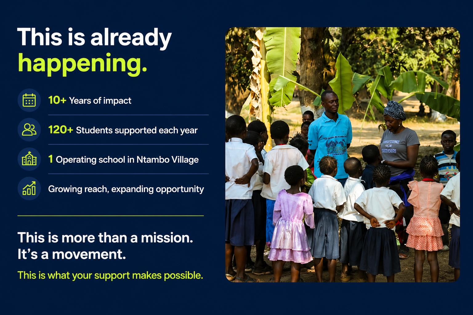 Our focus is on providing educational infrastructures, improving water quality/access, sanitation, supporting community building, and promoting environmental stewardship. We believe that every child deserves the chance to pursue their dreams, and we're committed to making a difference in their lives. With your support, we can do even more. Join us in addressing this pressing need and help us create a brighter future for the children of Ntambo village. Donate today and be a part of the change.